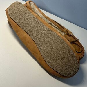 Minnetonka Cally Tan Suede Moccasin Slip On size 10 Faux Fur Lining Woman’s