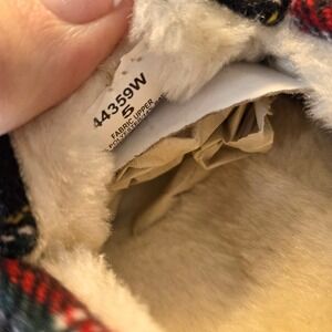 Keywords: Minnetonka, plaid slippers, moccasin slippers, women's slippers, house shoes, cozy slippers, red plaid, black plaid, size 5, faux fur lined, indoor slippers, casual slippers, holiday slippers, winter slippers