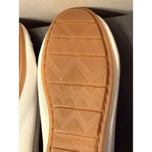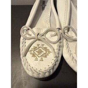 Minnetonka Deerskin Leather Gold Beaded Moccasins White Size 7.5/8 Rare Colorway
