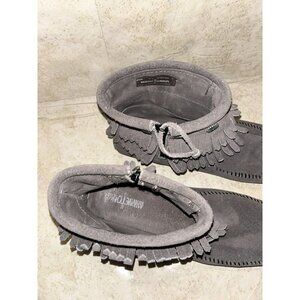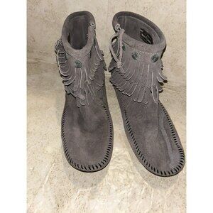 Minnetonka Double Fringe Gray Suede Moccasin Ankle Zip Booties Women 9.5