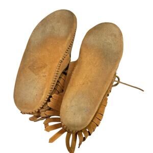 Classic suede moccasin boots with soft sole, rawhide lace, and fringe detail. Handmade, 4" height. Excellent pre-owned condition.