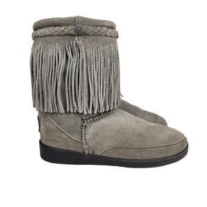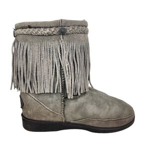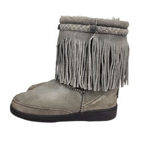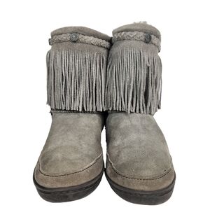 Minnetonka Gray Sheepskin Fur Lined Pug Boots Fringe Winter Moccasin Boot Size 7
