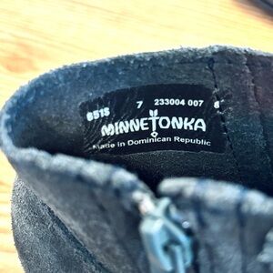 Description: Minnetonka gray suede moccasin-style ankle booties with fringe and a zipper closure.