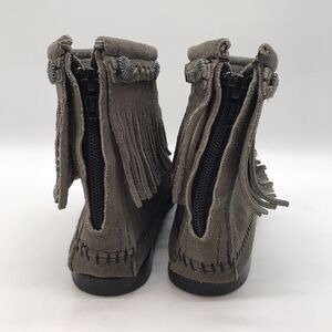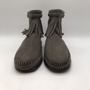 Minnetonka Gray Suede Moccasins Women's 7 Braided Fringe Back Zip Bootie 291T