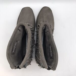 Minnetonka Gray Suede Moccasins. Women's size 7, Braided, Fringed, Conchos, Back Zip Bootie 291T.