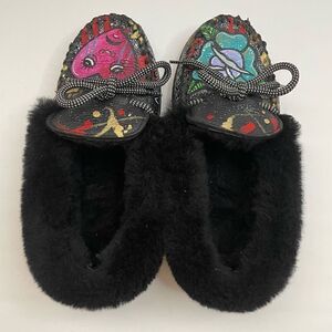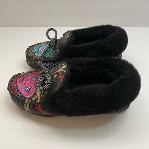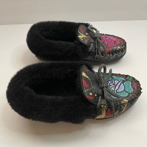 Minnetonka Handmade Custom Sheep Fur Lined Slippers Trail of Tears Art Women’s 5