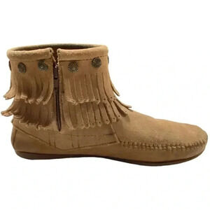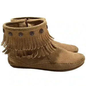 Minnetonka Hi Top Boots Womens 7 Brown Suede Double Fringe Side Zip Moccasin