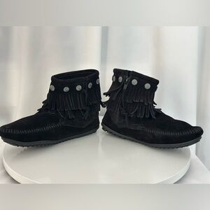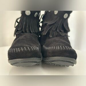 #Minnetonka #FringeBoots #BohoStyle #SuedeBoots #FestivalFashion #WesternChic #AnkleBoots #FallStyle #PoshStyle #BlackBoots
