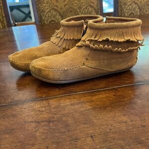 Minnetonka Ladies Ankle Fringed Moccasins. See photos for any minor flaws or wear. Great used condition. Style 2297T. Fits kids size 4 or ladies 6