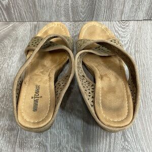 Minnetonka Lainey Laser Cut Suede Leather Cork Wedge Sandal Tan 9