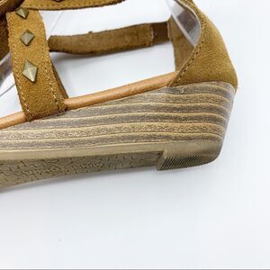 The buttery soft suede leather of these open-toe gladiator inspired wedge sandals from Minnetonka are embellished with brass diamond studs on the straps. The 1.5” stacked wedge and cushioned footbed make these a comfortable choice with jeans, shorts or skirts/sundresses. Sz 8 in barely worn condition as shown. One small stain near sole on a strap as shown. Please see photos for additional details. Ships same/next day. All offers considered. Like this item for price drops.