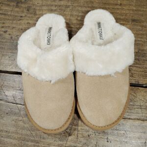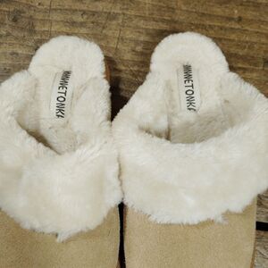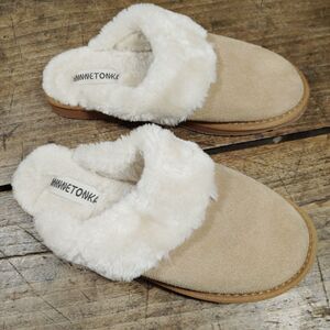 Minnetonka Moccasin Women's 10M Slippers Shoes Suede Tan Slide Faux Fur 40811. VGC. Smoke free home. Please see photos.