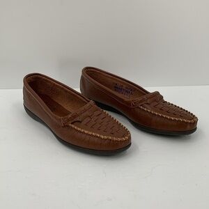 Minnetonka Moccasin brown leather shoe flat woven comfort USA slip-on women 10