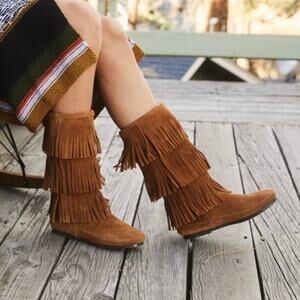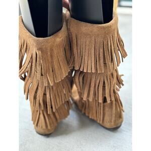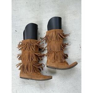 Minnetonka Moccasins 3 Layer Fringe Boot Brown Suede 1632 Calf High Boots Size 8
