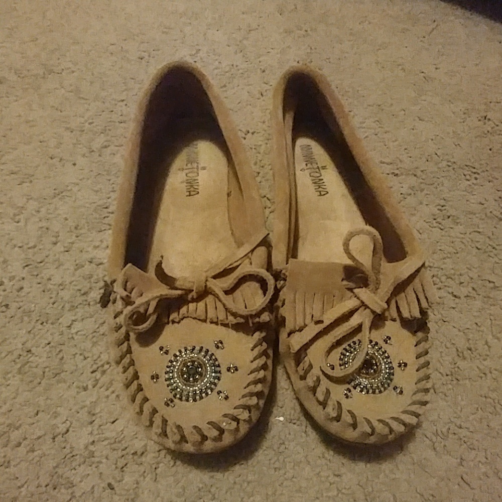 Tan moccasins with short fringe and beading, partially adjustable fit (can loosen or tighten with the ties for a wider or more narrow foot), still in great condition