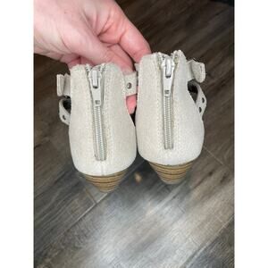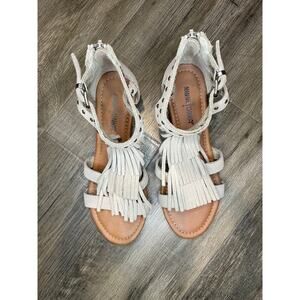 Minnetonka Monaco Sandal Stone Tan Suede Boho Fringe Stud 7 Leather Gray Strappy