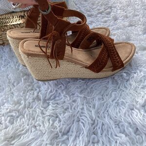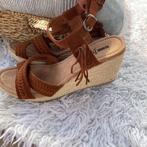 Minnetonka Naomi fringe ankle strap wedge espadrille sandals boho chic