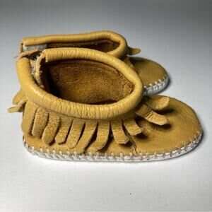 Minnetonka Pa-Poo-Shu Moccasin Natural Yellow Fringe Leather Baby Booties Shoes