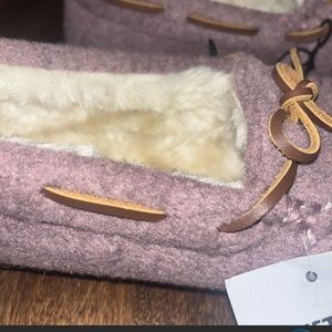 From Minnetonka get those little feet cozy in comfort in these Big Girls sz 5 moccasins from Minnetonka. Soft flannel covers the upper, while the cushy foam insole, soft faux fur lining and durable rubber outside provide the perfect amount of warmth, comfort and support. Wear them inside or out.
