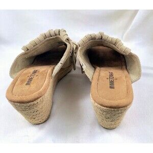These are Minnetonka Quinn suede peep toe wedges in tan, size 10 for women. They feature a fringe accent and a comfortable high wedge heel. The platform style gives a festive, hippie, and bohemian vibe, reminiscent of the 60s and 70s. The shoes are made of breathable suede material, perfect for a stylish and comfortable look.
