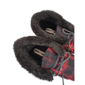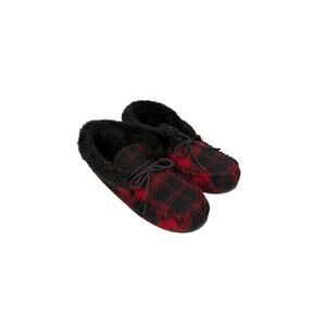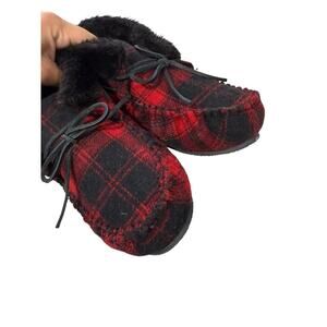 Minnetonka Red Buffalo Plaid Slip On Moccasin Slippers Holiday Cozy Womens 10