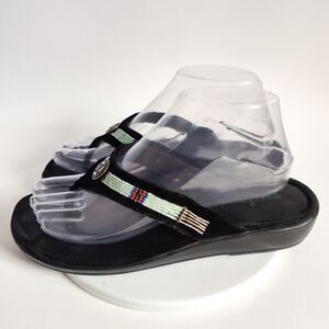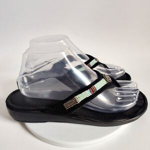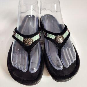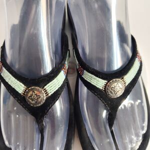 Minnetonka Sandals Size 8 Suede Black Flip Flops Silver Western Concho Beaded
