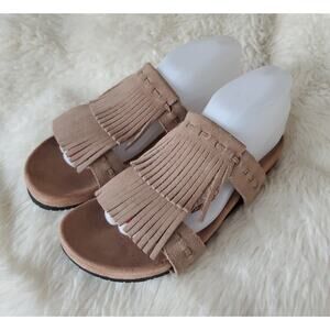 Minnetonka Slides Sandals Taupe Leather Low Heel Fringe Boho Slip On Women's 8