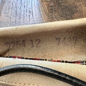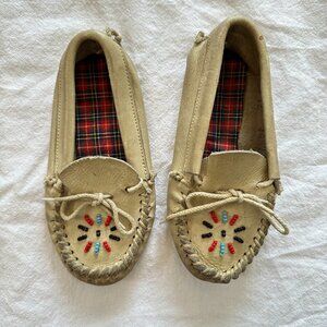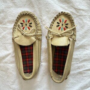Classic beige leather moccasins with hand-beaded designs in red, turquoise, and black, featuring traditional whipstitch detailing and red plaid interior lining. Timeless comfort and vintage craftsmanship. Measure 7 1/2” x 3 1/4”.