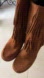 Stylish tan suede wedge boots with layered fringe. Ideal for boho fashion.