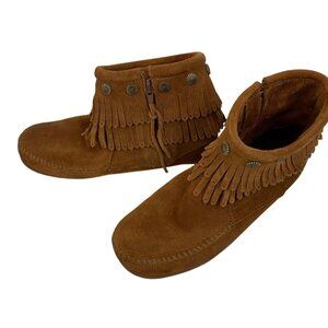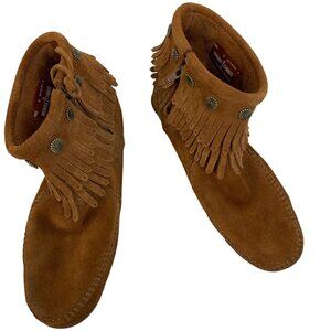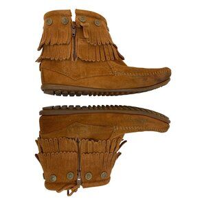 Minnetonka Sz 8 Womens Suede Fringe Moccasin Boots Tan Stud Zip Used