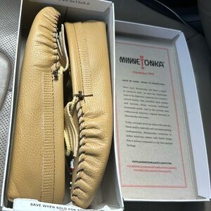 Comfortable Minnetonka moccasins in a tan shade. Comes in a branded box with logo.