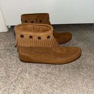 Minnetonka Tan Suede Fringed Side Zipped Boho Moccasin Ankle Booties Size 8