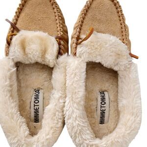 Minnetonka Tan Suede Shearling Lined Moccasin Slippers Size 8