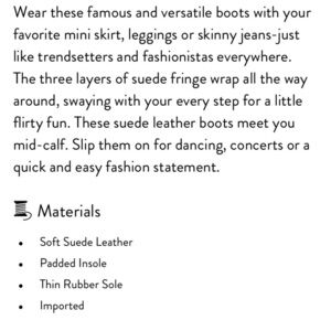 “Three tiers of fringe cover the shaft of a flat suede boot trimmed with whip stitching along the seams for added detail. Suede upper and synthetic sole.”