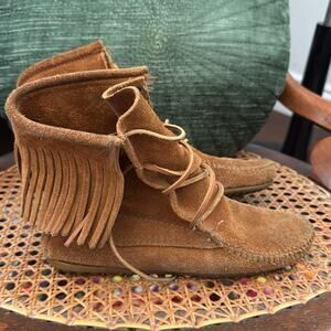 Minnetonka Tramper Tobacco Suede Lace Up Moccasin Fringe Booties