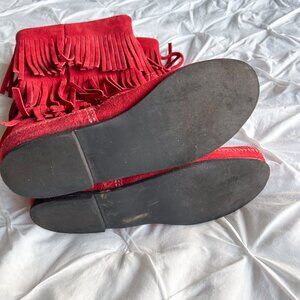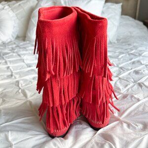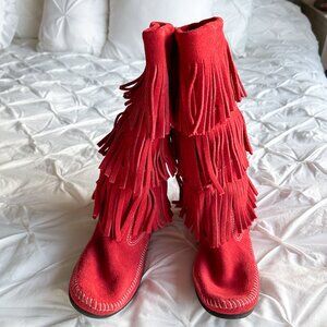 Minnetonka Vintage Red Suede Pull On Fringe 3 Layer Y2K Moccasin Boots