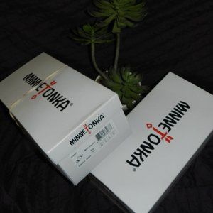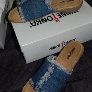 Minnetonka Wedge Sandal Frayed Blue Jean Comfort Slide in Sandal 🆕 Box📦⌚🏃🏻🚚
