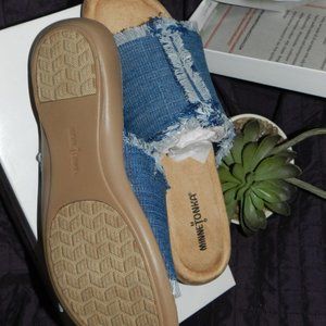 Minnetonka Slide on Wedge Sandal Frayed Durable Super Soft Denim Look Blue Jean