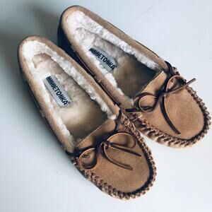 Minnetonka SZ 10 Suede Leather Lined Moccasin Slippers in Tan