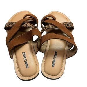 Step out in style with Minnetonka's chic brown and leopard sandals. Perfect for any casual outing, these sandals offer both comfort and fashion. Size 10, Next to new condition. (T)