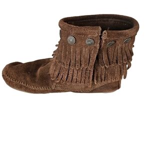 Minnetonka Womens Double Fringe Side Zip Boot Moccasin Brown SZ 6 Boho Hippie