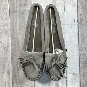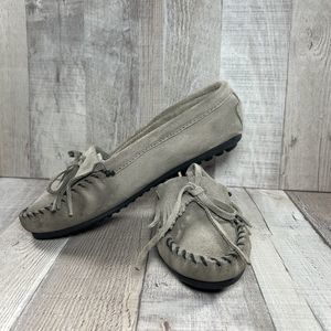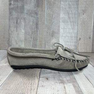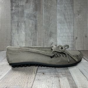 Minnetonka Women's Kilty Hardsole Suede Moccasin Loafer Slip On Gray Size 6.5
