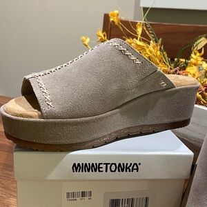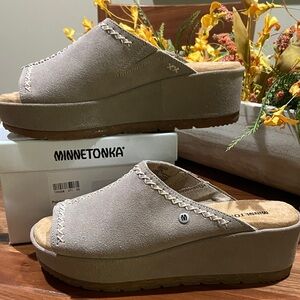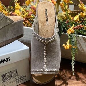 Minnetonka Women's Paislee Simply Taupe Suede Mules NWT Size 6 M