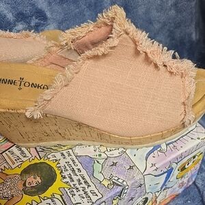 Stylish pink mules with frayed edges. Comfortable and trendy design.