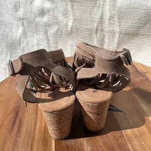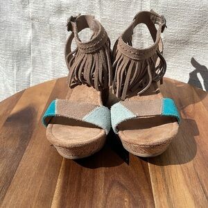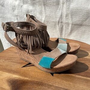 Minnetonka Poppy 71327 Tan Aqua Ankle Strap Fringe Suede Wedge Sandals Ladies 8.