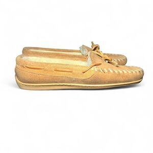 Minnetonka Women’s Sheepskin Lined Moccasin Slippers Size 7 Tan Suede Indoor Outdoor