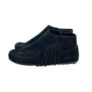 Minnetonka Women's Size 9.5 Black Suede Fringe Lacy Boho Moccasin Ankle Bootie