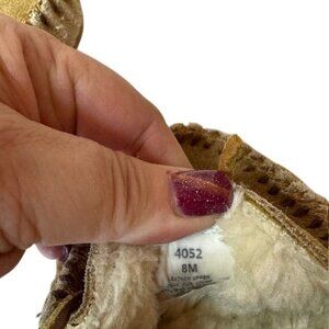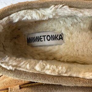 Minnetonka Womens Tan Suede Moccasin Slippers Size 8M With Faux Fur Lining & Rub