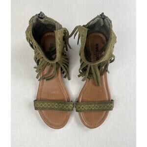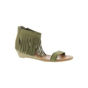 Minnetonka Womens Wedge Sandals Size 7 Loden Green Suede Antique Brass Studs. Small wedge about 1.5" high. Back zipper closure. Fringe detail.