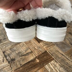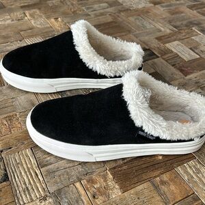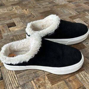 Minnetonka Women’s Black & White Zella Mule Clog Shoes NWT. Black leather suede upper. Faux fur lining. White rubber sole. Size 7
